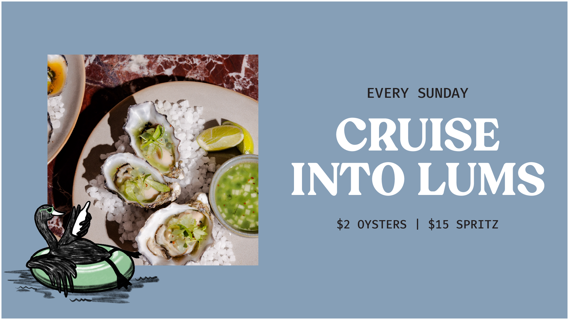 We’re shucking $2 oysters ‘til sold out and serving our new $15 Mini Martini + pintxos combo, all designed for a laidback Sunday session that’s just the right amount of indulgent.